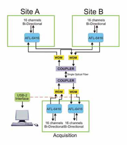 AFL-6400 可配置為遠程數據采集系統,在 PC 站點上使用 USB2 接口,在遠程站點上使用 AFL-6400。兩個站點之間的距離可能長達 50 公里。
