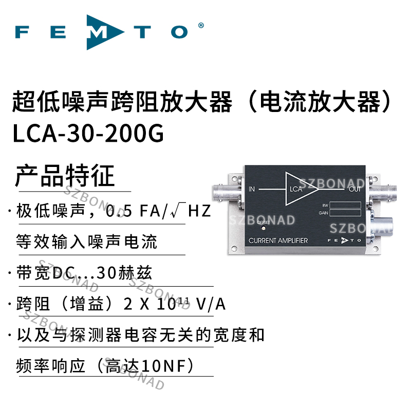 LCA-30-200G是德國FEMTO公司生產(chǎn)的超低噪聲跨阻放大器?,適用于高精度電流信號(hào)檢測(cè)場(chǎng)景,帶寬30Hz,跨阻增益:1×10^11 V/A。