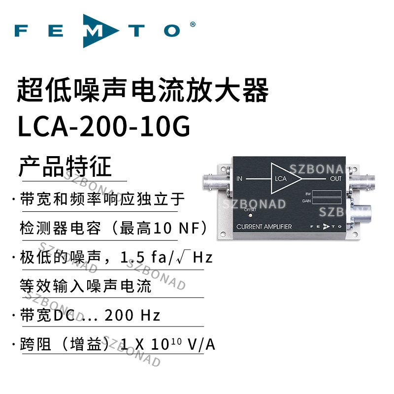 LCA-200-10G是德國FEMTO公司生產的超低噪聲跨阻放大器?,適用于高精度電流信號檢測場景,帶寬200Hz,跨阻增益:1×10^10 V/A。